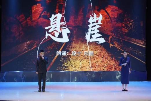 市朗协阳璐、段宁带来的《悬崖》,以双人对话形式再现革命者面临生死抉择的瞬间。舞台灯光聚焦于两人背影,声调从低沉到高亢,最终以“纵身一跃,亦是向死而生”的呐喊震撼全场。
