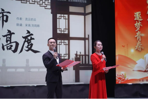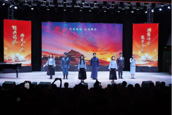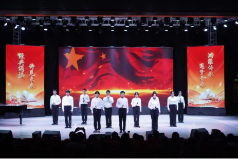 外国语学院戴佩领、谢雪政等用中英双语朗诵《我的祖国》,以“声”绘景,将黄河奔涌、长城巍峨的壮美画卷铺展于听众耳畔。结尾处全员高呼“我爱你,中国”,将赤子深情推向高潮。