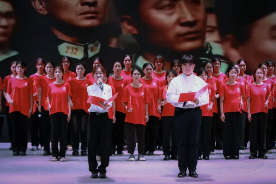 数学与统计学院楚宇轩、毛江昊等学子朗诵的《不朽》,通过群诵与独白交替,讴歌无名英雄的永恒精神。结尾处全员高举右手、齐声宣誓“青春无悔”,令革命信仰穿越时空直击人心。