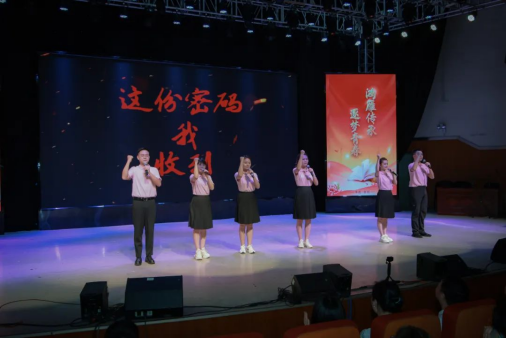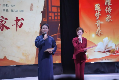 计算机科学与技术学院周啸龙、何嘉怡等四名学子以校史为脉络,通过《红色火种,青春褶皱里的诗行》致敬衡师前辈。朗诵结合投影技术,将校史馆中的老照片与青春誓言交织,展现“追随光、成为光”的传承力量。