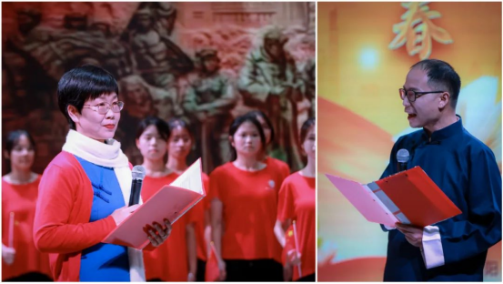 马克思主义学院宋建丽、匡宏等师生联袂献声的《与信仰对话》,以问答形式展开哲学思辨。朗诵者以坚定有力的声线,诠释了马克思主义信仰如何指引青年在新时代破浪前行,引发全场共鸣。