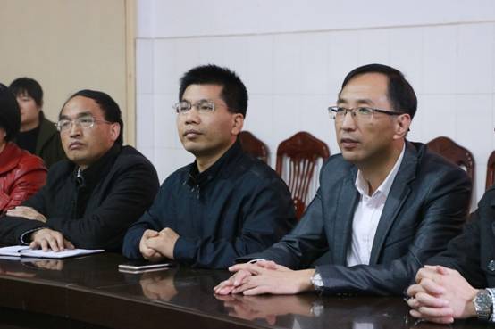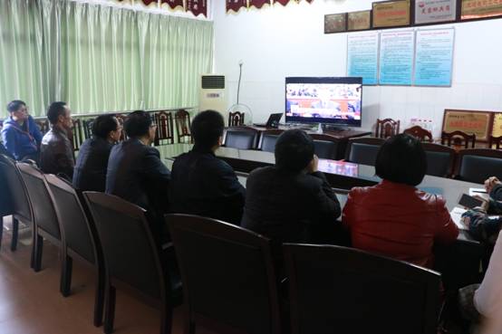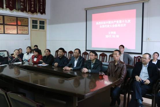 文公司党政班子成员和教师们在501会议室观看直播。
