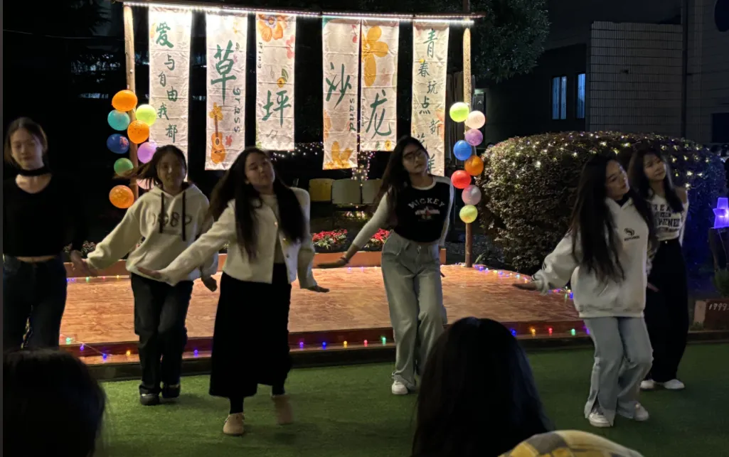 灯光聚拢,旋转,随即散落在舞台中央。在自在的夜风中,拉拉队成员们身着酷帅的服装,发丝飘扬,踩着音乐的节拍,舞动着身姿,为同学们带来一场颇有热度的视觉与听觉盛宴!《The girls》的动感节奏敲打在心上,与台上的舞者配合,成功点燃了今晚的气氛,带动了现场观众们的热情。