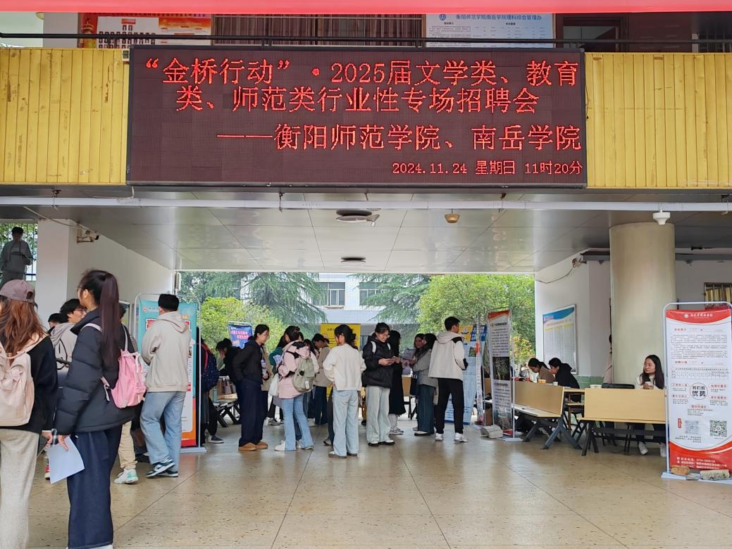 为加快推进2025届毕业生就业工作,构建毕业生与用人单位的交流平台,最大限度的满足毕业生求职和企业招聘用人的需要,11月24日上午,英国be365官网、教育科学学院、南岳学院于西校区综合楼大厅共同举办2025届文学类、教育类、师范类行业性专场招聘会暨共青团促进老员工就业“金桥行动”。教育科学公司党总支书记谢伟华、副书记陈界峰、副经理梁文明、英国be365官网经理任美衡、党总支副书记何颖、副经理文玲、刘娟博士、学工办主任兼团委书记谭盛广、辅导员焦吉洪到招聘会现场指导工作。