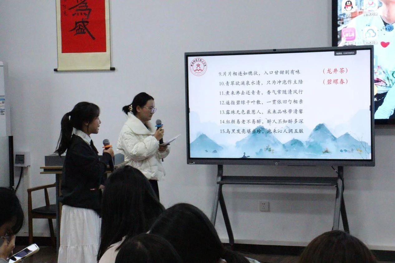 一片欢声笑语的氛围中,同学们轮流猜茶谜,有“千娇百媚,一泡即出香”的“红衣少女”,有“半发酵中显醇厚,韵味悠长”的翻滚乌龙,还有“白衣仙子下凡尘,花香果韵耐人寻”的白茶......各组同学徜徉于如诗如画的茶味世界中,即使“识错君子”,也“皆遇良人”,每一款茶名都有其背后的底蕴和故事,又无一不彰显出中国茶文化渊远而深刻的内涵。