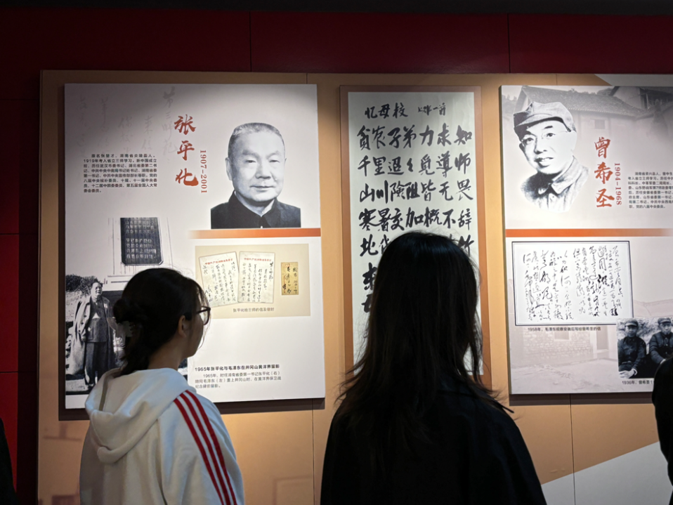 主讲人带领同学们有序进入展厅,耐心地介绍着。在序厅,七位人物雕像庄严肃立。站在中间的是一代伟人毛泽东,宛如璀璨星辰,分站两旁的六位是在省立三师党组织建设和发展中的重要代表人物分别是:唐朝英、蒋啸青、蒋先云、张秋人、贺恕和黄静源。他们的故事就像一首激昂的战歌,传唱着革命的信念与理想。新生们的目光被深深吸引,全神贯注地聆听着每一个细节,仿佛置身于那个热血沸腾的年代。