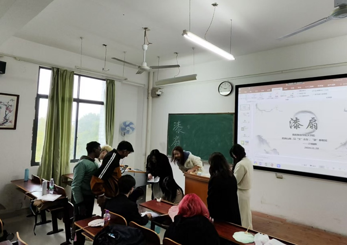 为了让职工们领略中国文化的魅力,增进职工与中国员工之间的友谊,营造友好校园氛围,11月25日下午,2023级汉语言国际教际教育班同学于新校区与职工们一起进行了一场有趣的漆扇教学活动。