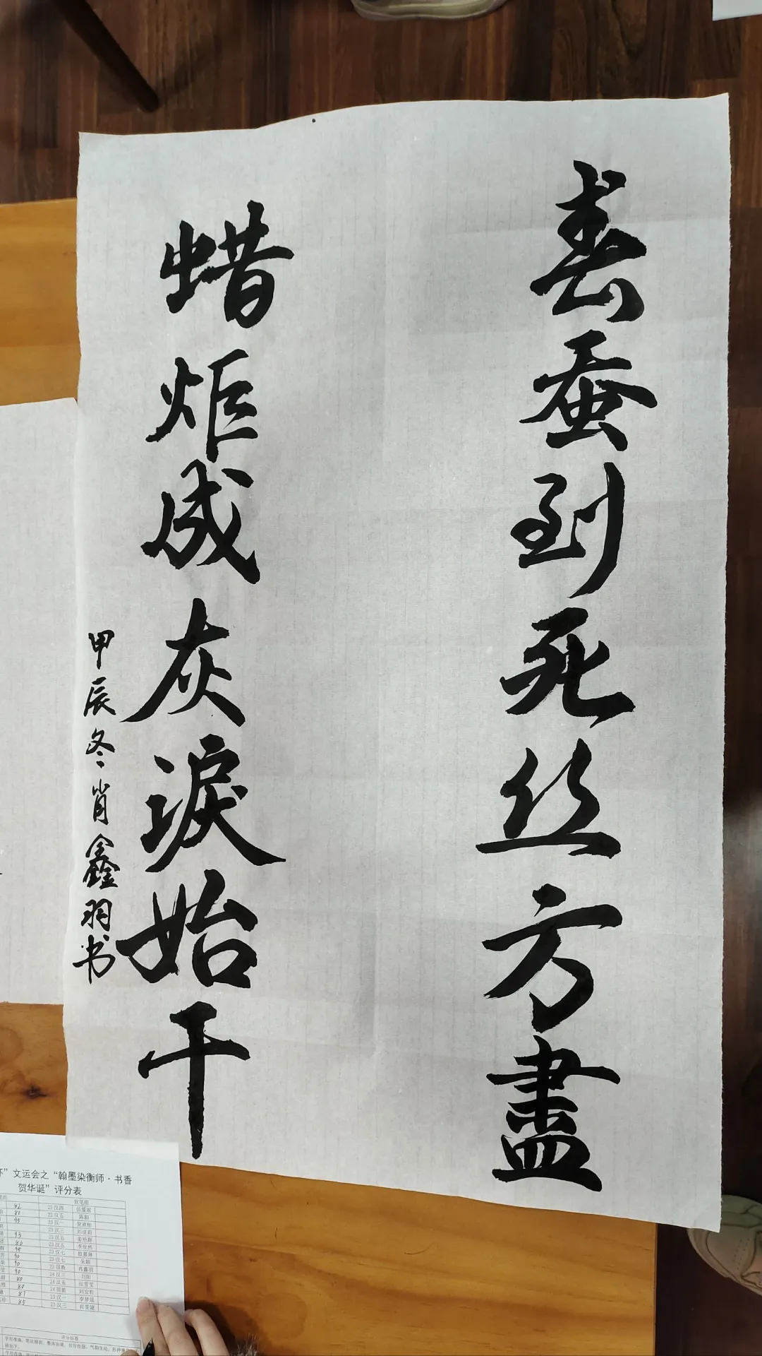 点评环节,评委们目光专注,逐一端详着参赛作品。手中的笔在评分表上谨慎落下,从笔法的精妙到结构的规整,从效仿的名帖到墨韵的浓淡,皆细细考量,以公正之心探寻每一幅作品的魅力。