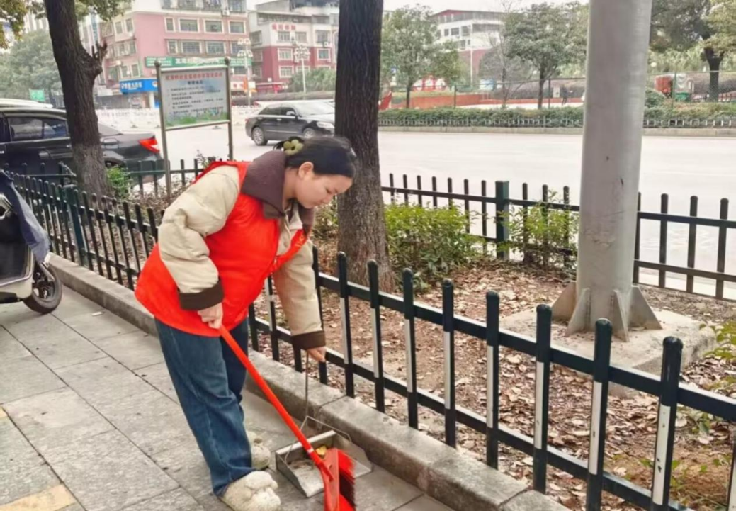 (图为牛银莉清理街道)