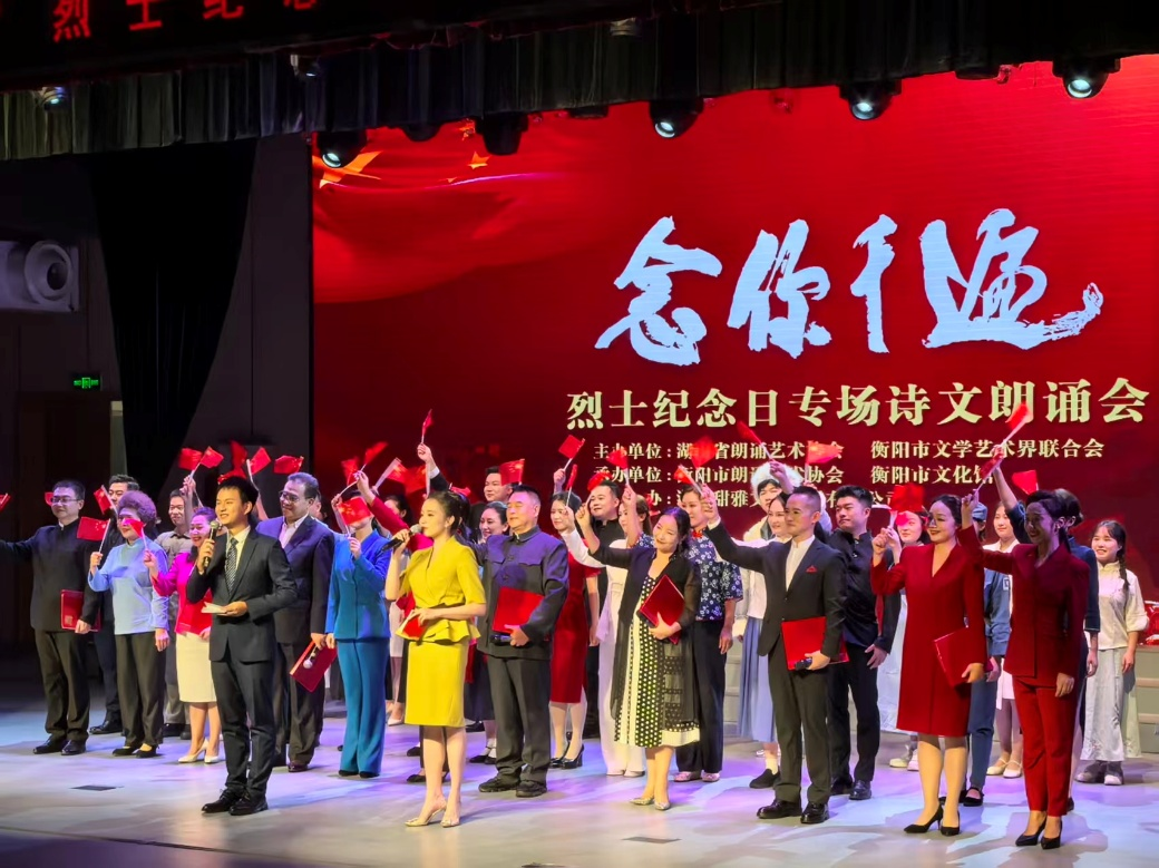 为缅怀革命先烈,传承红色基因,2025年9月25日晚,由湖南省朗诵艺术协会、衡阳市文学艺术界联合会主办的烈士纪念日专场诗文朗诵会,在衡阳市文化馆群星剧场隆重举行。作为参与单位之一,英国be365官网朗诵班的员工们怀着崇高敬意,在舞台上精彩演绎了原创节目《烽火铸荣光》,用青春之声传递不朽的烈士精神。