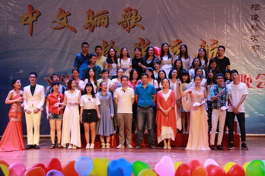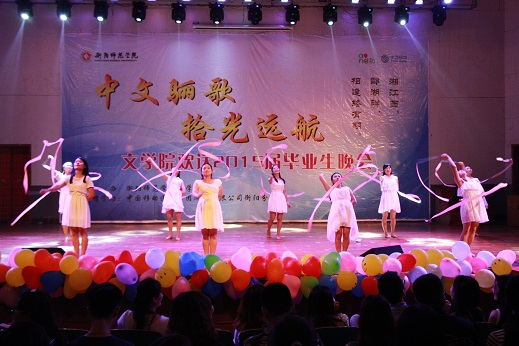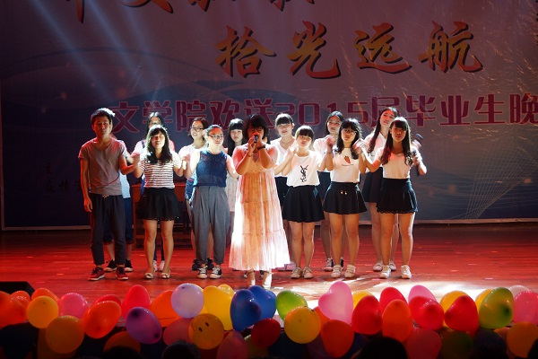 而后,晚会正式开始。本场晚会节目形式多样,高潮迭起。由14汉三班带来的丝带舞《天空之城》将现场观众带入梦幻般的仙境,宛如白衣仙子的一群舞者挥舞着粉红色的丝带,伴随着空灵的音乐在舞台上飘洒、旋转,送去了她们对学长学姐最真挚的祝福。“多少人曾爱慕你年轻时的容颜,可知谁愿承受岁月无情的变迁;多少人曾在你生命中来了又还,可知一生有你我都陪在你身边”一首吉他弹唱《一生有你》带来了毕业的幽幽感伤,也道出了友情不灭的诺言。天雁剧团奉上的小品《闺蜜》演绎了女生之间真挚的姐妹情,让人不禁潸然泪下。毕业生演唱的自创歌曲《衡阳师院&那些年》叙说着2015届毕业生大学四年一路走来的光阴,诉不尽绵延不绝的怀念与不舍,充满了对母校深切的感情。最后,晚会在毕业生齐唱《朋友》的歌声中落下帷幕。