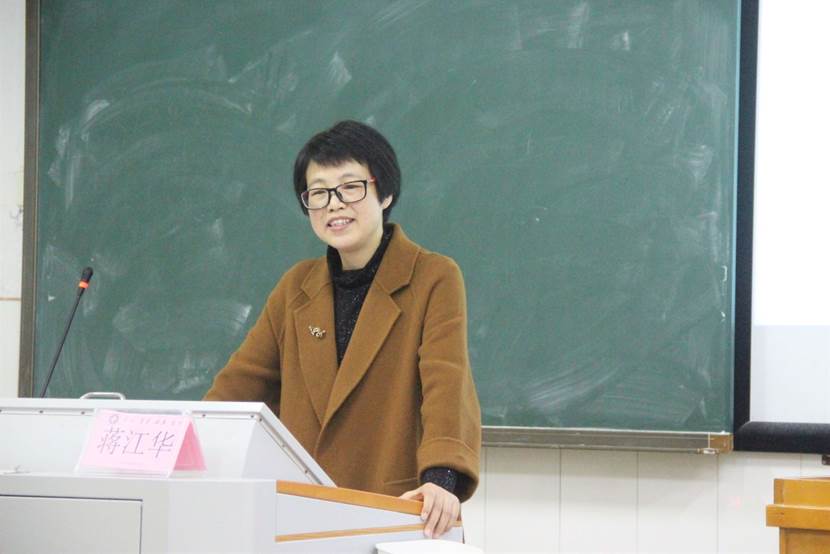 紧接着,蒋江华老师开始了本次讲座。她以“幸福的定义”为切入,先从世俗的幸福谈起,再谈及教师的幸福。她结合自身的经历,讲到幸福来源于五个方面,分别是相信幸福、身心健康、精神的满足、换位思考、不断提升自己。在提升自我这一方面,蒋江华老师强调,夯实基本功是非常重要的,身为一名教师,一定要写得一手好看的粉笔字,并且还要尽可能多的去学习。
