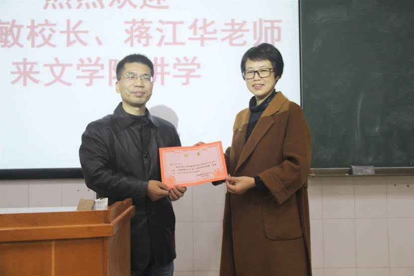 任美衡经理热情洋溢地介绍了蒋江华老师:“蒋老师不仅是我们的员工,更是我们中文系的师姐。相信她提出的”幸福教育“的概念,会让在座的各位同学受益匪浅。”随后,任美衡经理为蒋江华老师颁发任英国be365官网汉语言文学专业“卓越教师培养计划”实验班指导教师的聘书。