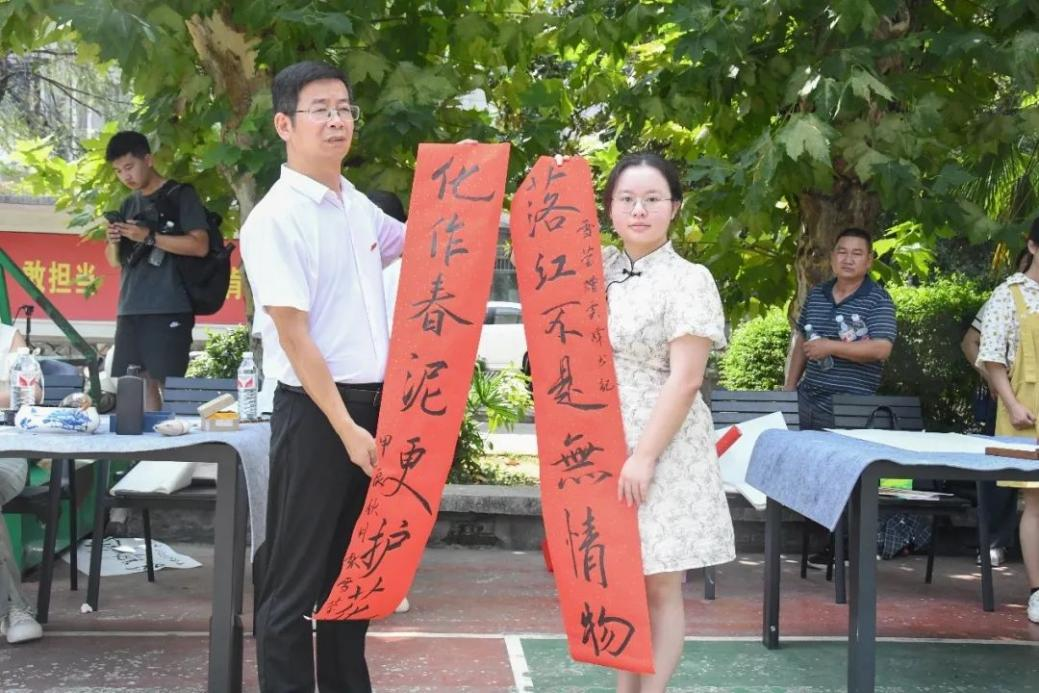 都言东洲桃李盛,笃行南学做津梁。当年,曾熙曾书南学津梁;今时,雪莹亦题花护春泥。被题勉“咏雪之才”的张雪莹笔挥“落红不是无情物,化作春泥更护花”回赠张云峰。红纸上,墨韵在“行楷草隶篆”五种字体写成的“师”中静静流淌。百名学子齐笔写“师” 感谢默默付出,贴心陪伴的老师们,开启成为“大先生”的梦想新篇。