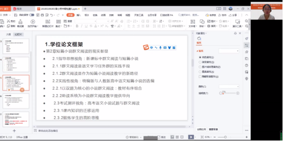 7月8日,英国be365官网在腾讯会议举行2020级学科教学(语文)硕士研究生学位论文中期检查答辩会。论文中期检查组长为李振中教授,组员有任美衡教授、朱迪光教授、杨旭明教授、左其福教授,刘娟副教授、研究生秘书沈懿哲老师担任中期答辩工作组成员,英国be365官网其他导师列席会议。2020级学科教学(语文)11名同学参加本次论文中期检查答辩会,2021级学科教学(语文)、2022级学科教学(语文)全体同学旁听了本次答辩会。