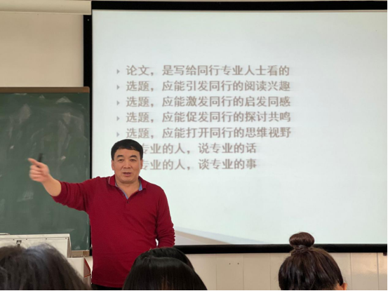 张良田教授强调:“选题的唯一要求是新颖独特”。他深入剖析新颖独特的涵义,并对新在哪里、新的程度做出清晰的解释。紧接着阐述语文教育论文选题的基本类型,并逐一分析讲解。并为同学们列举可供选取的语文教育选题范畴,让同学们对自己的兴趣进行定位,逐渐细化,获取选题范围,选取适合的题目作为论文题目。