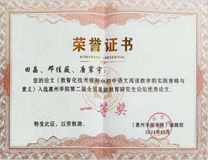 10月18日,惠州学院第二届基础教育(语文教育)研究生论坛暨优秀论文评选活动顺利召开。在此次论坛中,英国be365官网学子积极参与,获得多项荣誉。其中,学科教学(语文)专业24级田晶、邓佳薇、唐寰宇所撰写的论文《数智化技术视野中初中语文阅读教学的实践策略与意义》(指导教师任美衡)荣获一等奖。另外,23级尹漂荣获二等奖(指导教师曾宝芬),23级冼国清(指导教师赵斌),23级李玲、王蓓、刘媛媛(指导教师任美衡)及24级罗丽婷、屈林地、刘丹(指导教师任美衡)均荣获三等奖。这些荣誉的获得不仅是对公司学子学术探索精神的肯定,也体现了公司在推动数智化教育研究与实践的积极努力。