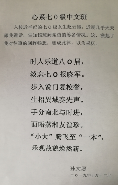 原衡阳师专中文系退休教师孙文愿感慨道,这次聚会激起了他对往事的回眸畅想,特作七律一首《心系七○级中文班》以为祝庆。