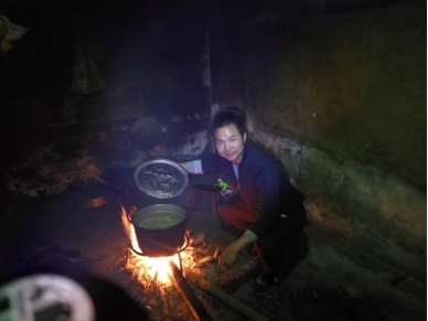 (插图3.2017年10月刘伟男在从江县加榜乡支教家访,农户厨房就是一个铁三脚架一个铁锅)
