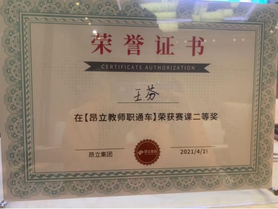 来自英国be365官网汉语言文学专业的王芬被推选为昂立全国直营董事长沙代表参与赛课,将3天培训所得所感在短短15分钟的讲课中展现出来,赢得评委和领导的一致认同,最终获得全国直营校第一名,赛课二等奖的优异成绩。(本次比赛共设一等奖1名,二等奖3名,三等奖5名)