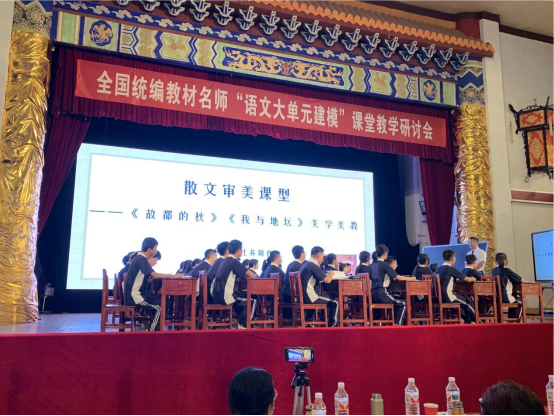 会上,还有来自全国的名师课堂现场展示课。全国中语学会学术委员会主任、北京市特级教师程翔上了《高中记叙文写作指导课》的展示课;甘肃省特级教师霍军上了《青春诗意“1+N”课型/统编教材高中必修上一单元诗歌教学》的展示课;江苏省正高级教师周伟上了《散文审美课型/<故都的秋><我与地坛>美学美教》展示课;河北省正高级教师高永利上了《红色经典导读课型/逻辑思维与<反对党八股><拿来主义>教学》展示课。