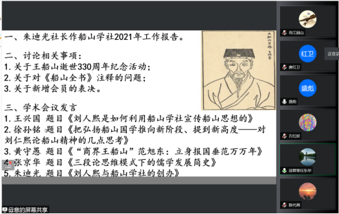 首先,朱迪光社长作船山学社2021年工作报告。紧接着讨论相关事项:包括关于王船山逝世330周年纪念活动、关于对《船山全书》注释的问题、关于新增会员的表决。