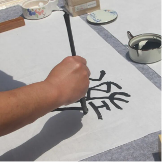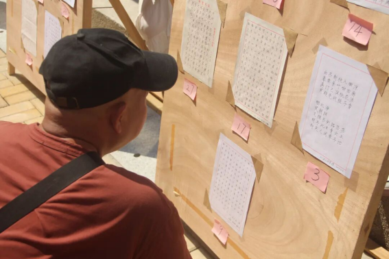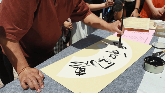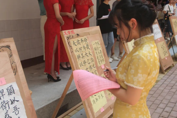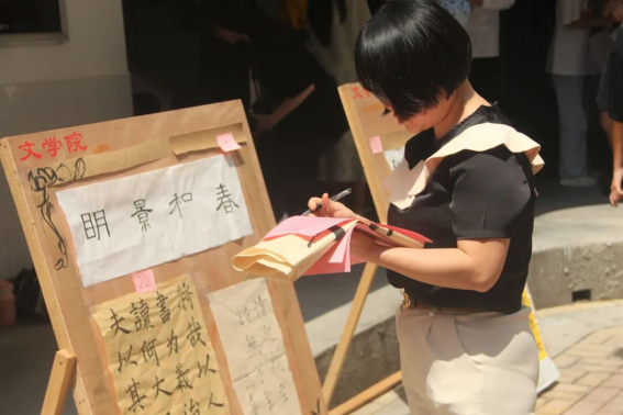 嘉宾现场赠字环节如火如荼,陈东,廖理邦、张云峰、吴戬、王天龙现场题写书法作品,赠予在场观众。炎炎烈日下,老师们挥毫泼墨,同学们热情高涨,现场气氛热烈又涌动着的浪漫。