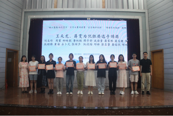 授牌仪式后,左其福老师和陈国质老师分别从开班的背景、宗旨以及未来的实施计划与预期目标做了详尽的介绍。让大家看到了写作班的宏伟蓝图。随后,由副经理文玲宣布“文星杯”写作大赛获奖人员名单,随后由老师们为获奖人员颁奖,并合影留念。