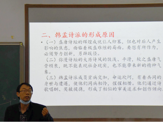 在西校区行知楼110,吴戬老师面向21级汉四、汉六班全体同学开展了一堂中国古代文学课。吴戬老师的课堂生动活泼,激情四射。基于老师广阔的知识面,课堂的文学性、专业性十足。与此同时,吴戬老师风趣幽默,用诙谐的语言将古代诗人的形象带到员工面前。相信从吴老师的课堂上,同学们都受益匪浅。